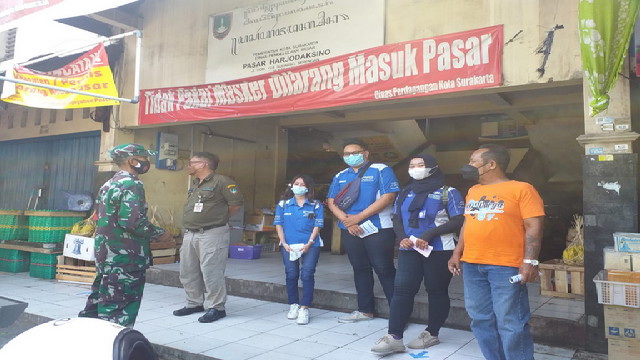 Surakarta.- Bati Bakti TNI Koramil 03 Serengan Kodim 0735 Surakarta Serma Fitalis dan anggota Satpam Pasar Harjodaksino melakukan langkah pencegahan penularan dan pemutusan mata rantai penyebaran virus corona (Covid-19) dengan mensosialisasikan protokol kesehatan serta berikan himbauan kepada pedagang dan Pengunjung di pasar harjodaksino, gemblekan ,Kelurahan Danukusuman ,Kec Serengan Kota Surakarta, Rabu 08/09/2021.