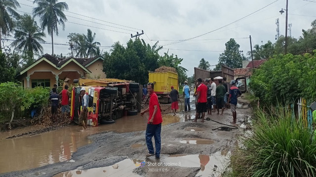 Menurut Nurul warga setempat yang melihat kejadian tersebut Insiden terjadi bermula kendaraan Truck dengan Nopol BE 8097 JX hendak menjual hasil bumi nya ke pabrik singkong, namun naas, karena menghindari Lubang kendaraan tersebut tergelincir yang mengakibatkan Truck tersebut terguling.