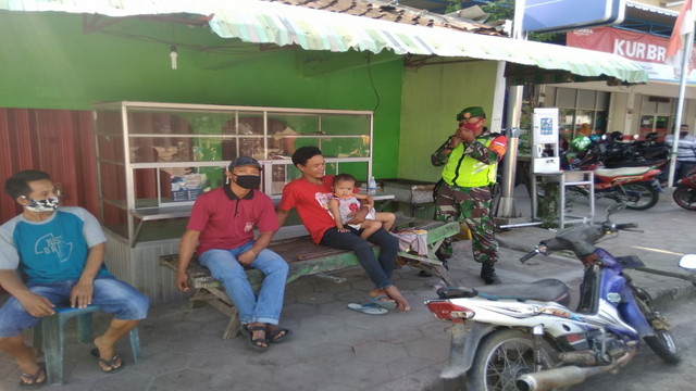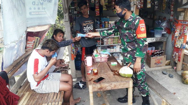 Lanjutnya, Seperti saat ini Babinsa mendapati para pemuda yang sedang berkumpul tanpa mengenakan masker di sebuah warung. Sebelum memberikan masker gratis Babinsa memberikan sanksi berupa menyanyikan lagu wajib dan Push up sebagai pengingat agar senantiasa menggunakan masker saat keluar rumah.
