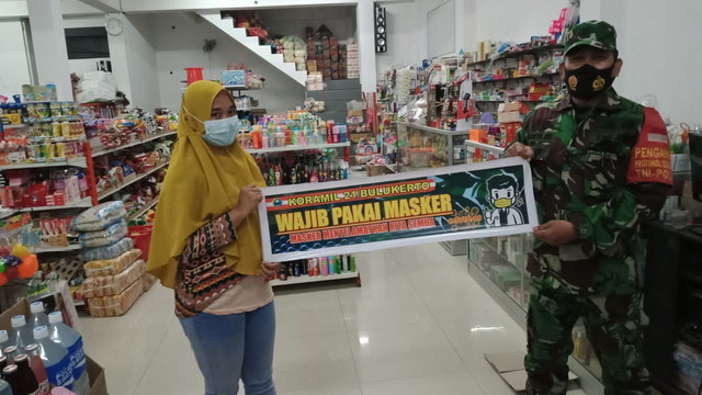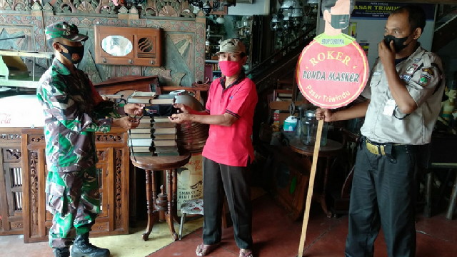 Disela-sela kegiatan himbauan protokol kesehatan, Babinsa juga membagikan 100 masker gratis kepada pedagang dan pengunjung Pasar Triwindu.