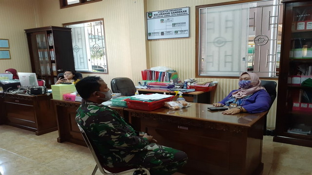 Tampabatas.com(SMSI), Surakarta.- Senin 06/07/2020 pukul 09.00 WIB Babinsa Gandekan Serda.Teguh K anggota Koramil 04/ Jebres Kodim 0735/Surakarta melaksanakan kegiatan Komunikasi Sosial dengan Arik Ramadhani SH, MM Kepala Kelurahan Gandekan Kecamatan Jebres Kota Surakarta.