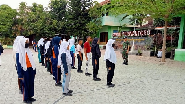 Wonogiri. – Untuk membentuk pribadi yang tegap, tangkas dan disiplin bagi para pelajar, SMP N 1 Purwantoro menggandeng Koramil 19/Purwantoro untuk memberikan pelatihan PBB (Peraturan Baris Berbaris).