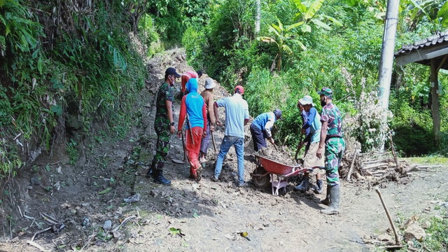 BOYOLALI. Babinsa Pentur Koramil 12/Simo Kodim 0724/Boyolali Sertu Supardi dan Koptu Nuryanto Serma bersama masyarakat Dukuh Pancuran, Kelurahan Pentur, Kecamatan Simo, Kabupaten Boyolali bahu membahu membersihkan longsoran tanah akibat hujan deras yang terjadi beberapa akhir-akhir ini, Rabu 13/01/2021.
