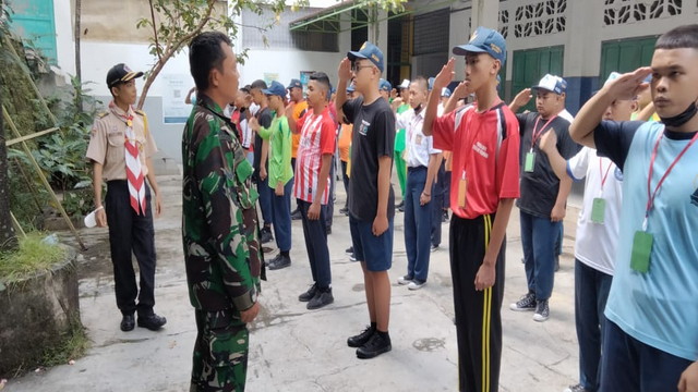 Surakarta. – Batituud dan Babinsa Kelurahan Jebres koramil 04) Jebres kodim 0735/Surakarta pelda Mulyono Sertu Suparno dan Serda Winarno Melatih Latihan Dasar Kepemimpinan Siswa (LDKS) SMK Warga jl kolonel Sutarto no 81 Jebres Surakarta yang diikuti oleh 250 orang siswa yang di laksanakan selama 3 hari.Selasa 12/07/2022 pukul 12.45 s/d 14.30 wib.