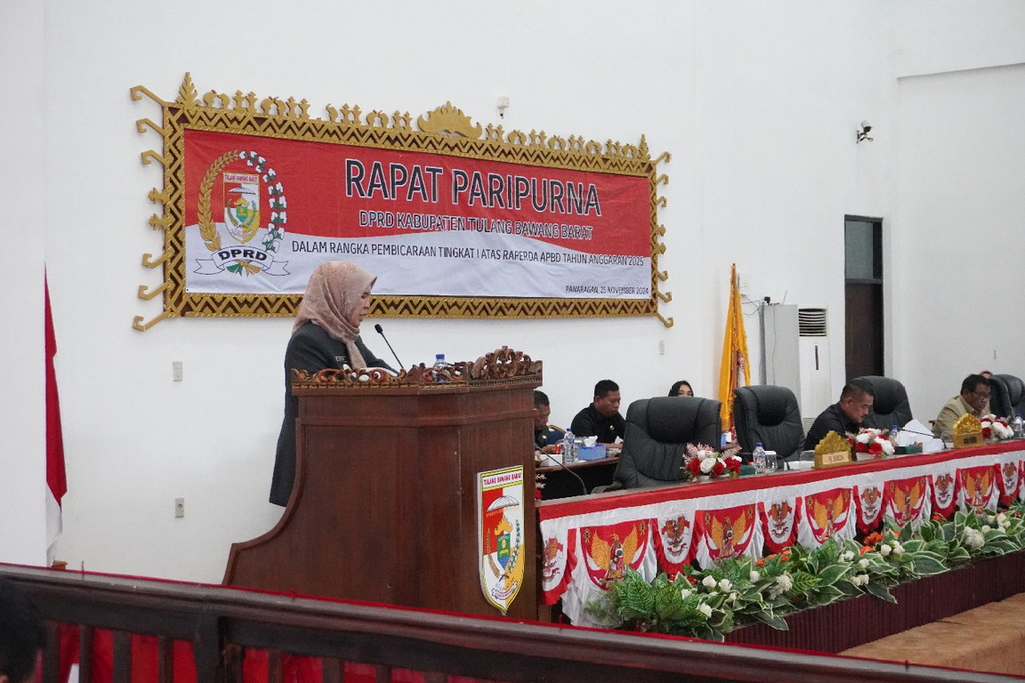 Penjabat (PJ) Sekretaris Daerah Tulang Bawang Barat (Tubaba) Dra. Bayana, M.Si., sampaikan Rancangan Peraturan Daerah (Raperda) Kabupaten Tubaba pada Rapat Paripurna Pembicaraan Tingkat I Atas Raperda APBD Tahun Anggaran 2025, di Ruang Rapat Paripurna DPRD setempat. Senin (25/11/2024).