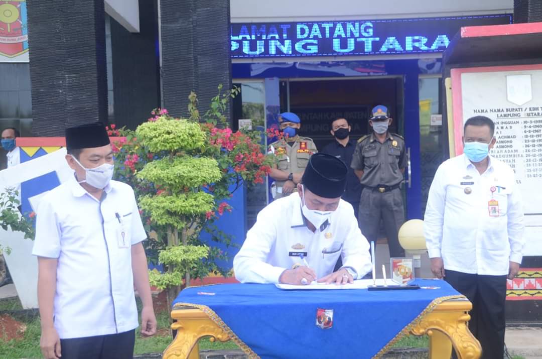 (H.Budi Utomo Plt.Bupati Lampung Utara tanda tangani berita acara serah terima bantuan kendaraan dari PT.Bank Lampung.)