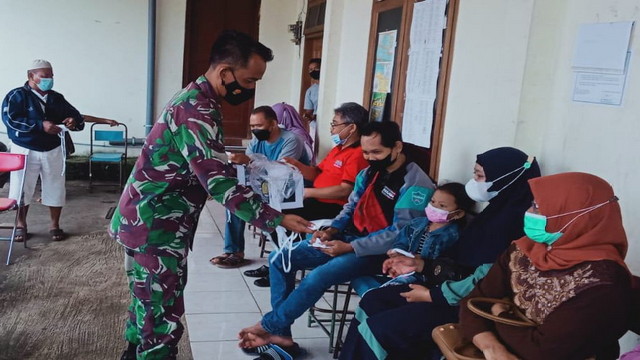 Di sela-sela kesibukannya bekerja Serda Agus Guridno tanpa sengaja melihat ada warga yang tidak menggunakan masker. Serda Agus pun langsung membagikan masker kepada warga yang membutuhkan.
