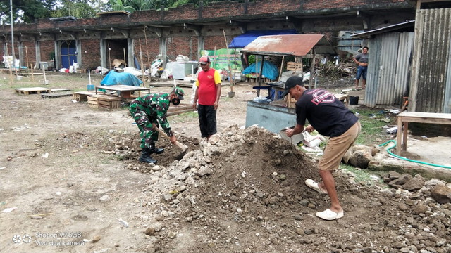Sragen.- Serda Sudarman Babinsa Ds. Dukuh Anggota Koramil 10 /Tangen Kodim 0725/Sragen melaksanakan kegiatan Karya Bakti pengurukan jalan pasar kauman yang berlubang di Desa Dukuh Kec. Tangen, Kamis 01/09/2022.