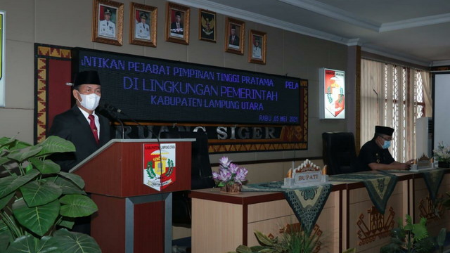 Lampung Utara. (Lampura)- Bupati Lampung Utara Hi. Budi Utomo, S.E.,M.M., melantik dan mengambil sumpah tiga pejabat pimpinan tinggi pratama di Aula Siger, Pemkab setempat, Rabu (05/05/2021).