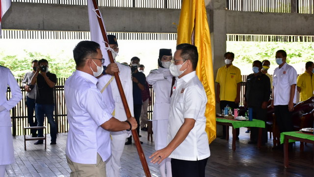 Bupati Tulangbawang Barat Umar Ahmad, SP memberikan sambutan pada upacara pengukuhan dan pelantikan pengurus Komite Olahraga Nasional Indonesia (KONI ) Tubaba di Rumah budaya Sessat Agung Bumi Gayo Ragem Sai Mangi Wawai komplek islamic center. Tubaba, Rabu 16/06/2021.