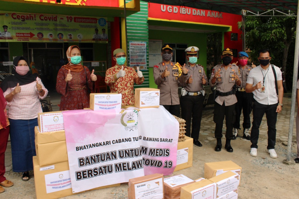 dan sembako berupa susu,makanan suplemen kepada tenaga medis di halaman Puskesmas Poned Panaragan Jaya, untuk membantu tenaga medis supaya tetap Pit dan selalu sehat sebagai upaya untuk memutus mata rantai penyebaran virus corona. Bantuan tersebut berasal dari Ibu Bhayangkari Polres Tulangbawang Barat.
