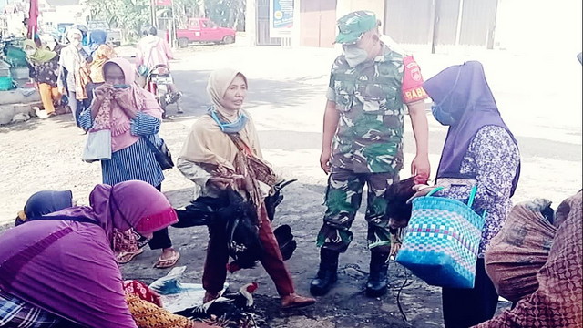 Wonogiri – Babinsa Koramil 17/Sidoharjo Serda Gunawan datangi warga di pasar karena banyak yang tidak memakai masker, Babinsa langsung berikan imbauan kepada pedagan, Minggu 20//2/2022.