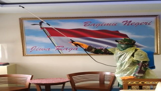 Brigade infanteri 4 Marinir/BS laksanakan penyemprotan cairan Disinfektan dalam rangka mengantisipasi dan meningkatkan kewaspadaan terhadap penyebaran virus Covid-19 di Mako di Mako Brigif 4 Mar/BS Piabung Padang Cermin Pesawaran Lampung. Senin (23/03/2020).