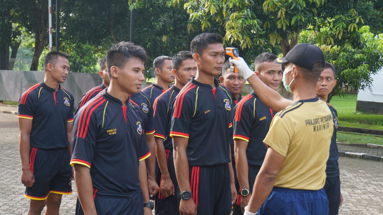 Sebelum dilaksanakan penyemprotan cairan di sinfektan terlebih dahulu diadakan pemeriksaan suhu tubuh oleh anggota Kima dan anggota Balai Kesehatan Piabung kepada para prajurit Brigif 4 Mar/BS yang akan melaksanakan dinas yang dilaksanakan di depan penjagaan pintu masuk utama Mako Brigif 4 Mar/BS.