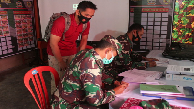 Letkol Inf Idang dengan didampingi Bapendim Serma Indra Hidayat mengecek perolehan publikasi yang telah dikumpulkan. ” Tingkatkan terus publikasi selama berjalannya TMMD”.ucapnya.