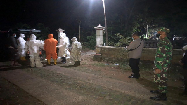 Wonogiri – Babinsa koramil Koramil 19/Purwantoro Serda Masrukin, bersama Anggota Polsek Bripka Suseno, dan Briptu Gibran dan Relawan jogo tonggo melaksanakan pendampingan prosesi pemakaman salah seorang warga yang meninggal karena terpapar Covid-19 bertempat di TPU Dsn Bangsri Rt 04/02 Desa Bangsri Kec. Purwantoro. Minggu 04/07/2021 malam.