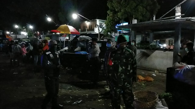 Surakarta.- Komandan Koramil (Danramil) 03 Serengan Kodim 0735 Surakarta Kapten Inf Tri Sakti K dan Anggotanya mengajak Lurah Pasar, Karyawan dan Satpam Pasar Harjodaksino melaksanakan pengecekan Penerapan Protokol Kesehatan bagi para Pedagang maupun para pembeli, di Pasar Harjodaksino, Senin 17/05/2021.