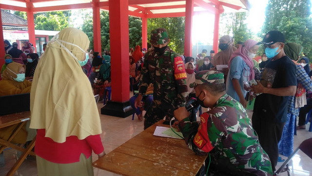 Wonogiri. – Danramil 24/Puhpelem Kapten Inf Tono beserta jajaran Forkopincam, meninjau pelaksanaan vaksinasi warga yang di selenggarakan oleh Puskesmas Kecamatan Puhpelem yang bertempat di Pendopo Kecamatan, Selasa 12/10/2021.