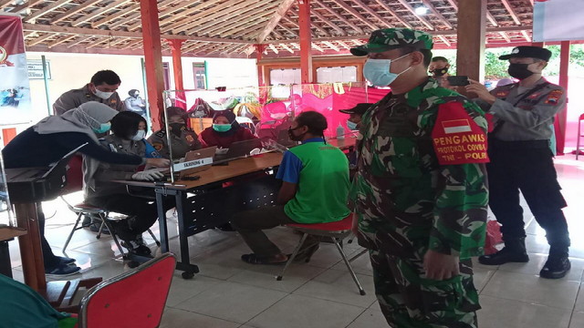 Wonogiri. -Program Vaksinasi Covid-19 di wilayah kabupaten Wonogiri telah berjalan dengan sasaran Vaksinasi kini di konsentrasikan bagi Lansia Kecamatan Ngadirojo. Untuk pelaksanaan di wilayah kecamatan Ngadirojo, Babinsa Koramil 03/Ngadirojo bersama anggota Polsek melakukan pendampingan dan memantau kegiatan Vaksinasi yang di selenggarakan oleh UPTD Puskesmas Ngadirojo, Kabupaten Wonogiri, Minggu 01/08/2021.