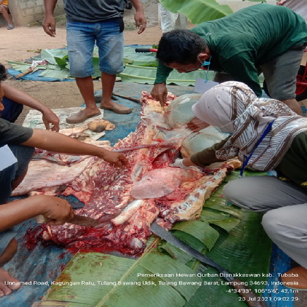 Dinas Peternakan dan Kesehatan Hewan (Disnakkeswan) Kabupaten Tulangbawang Barat menerjunkan tim di beberapa lokasi pemotongan hewan kurban yang tersebar di berbagai masjid dan mushola di 9 Kecamatan, Selasa 20/07/2021.