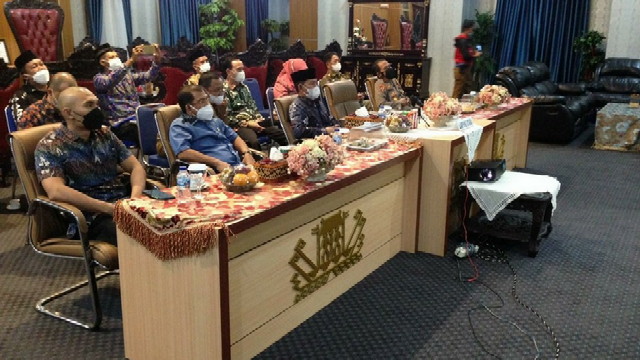 Rapat Koordinasi mengenai Evaluasi Perkembangan Pelaksanaan Pemberlakuan Pembatasan Kegiatan Masyarakat (PPKM) mikro di 34 provinsi secara serentak diadakan melalui video conference (vidcon) di Rumah Jabatan Bupati Lampung Utara, Senin 14/06/2021 lalu.
