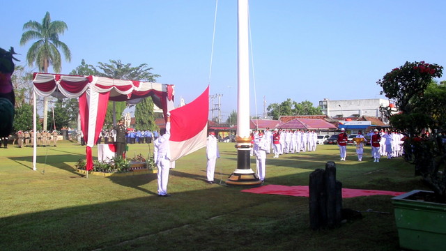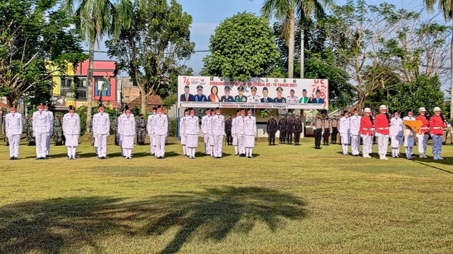 Lampung Utara (Lampura).- Upacara peringatan detik-detik Proklamasi Kemerdekaan dalam memperingati HUT RI Ke-76 di gelar di halaman Kantor Bupati Lampung Utara, Selasa 17/08/2021 pukul 07:00 WIB.