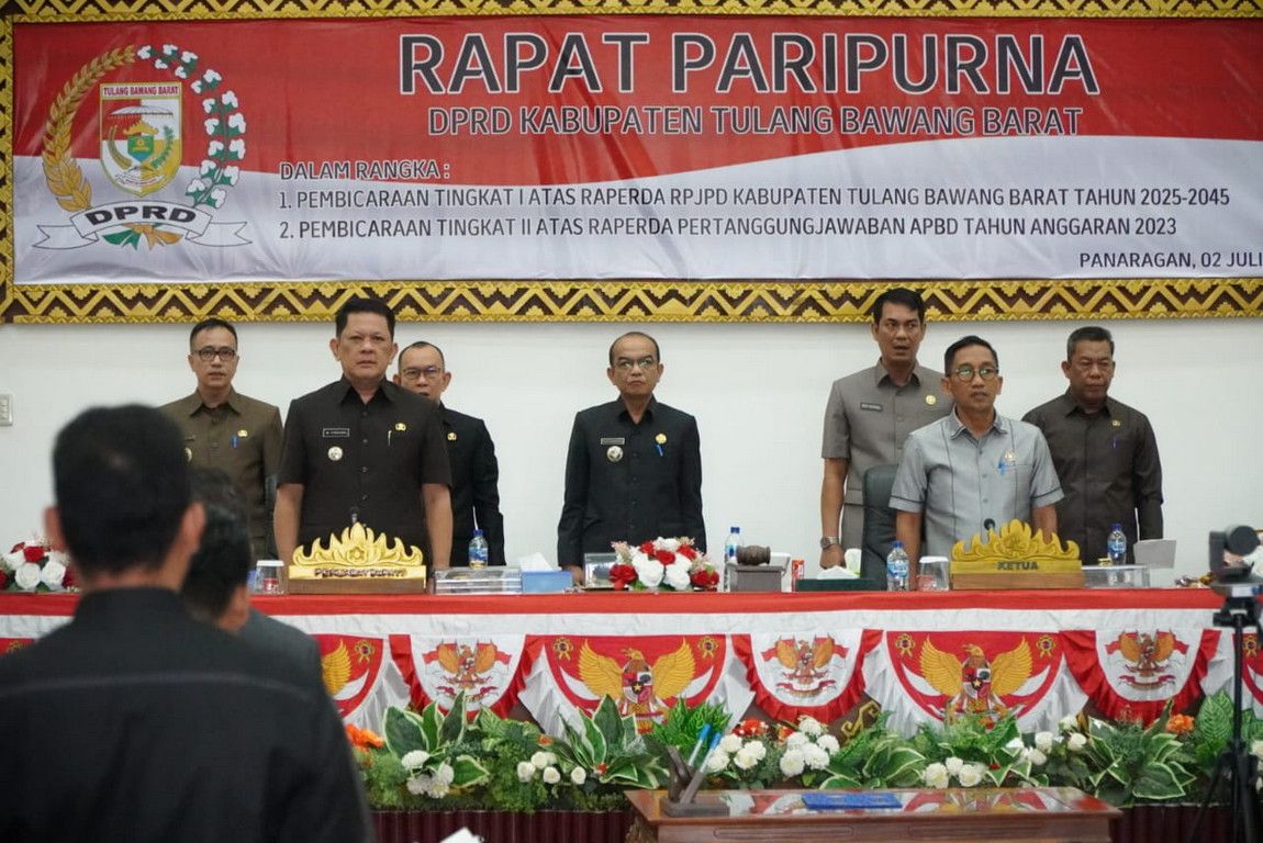 Pembicaraan Tingkat I Atas RPJPD Kabupaten Tubaba Tahun 2025-2045 dan Pembicaraan Tingkat II Atas Raperda Pertanggungjawaban APBD Tahun Anggaran 2023, dihadapan Rapat Paripurna DPRD Tubaba, Selasa (02/07/2024).