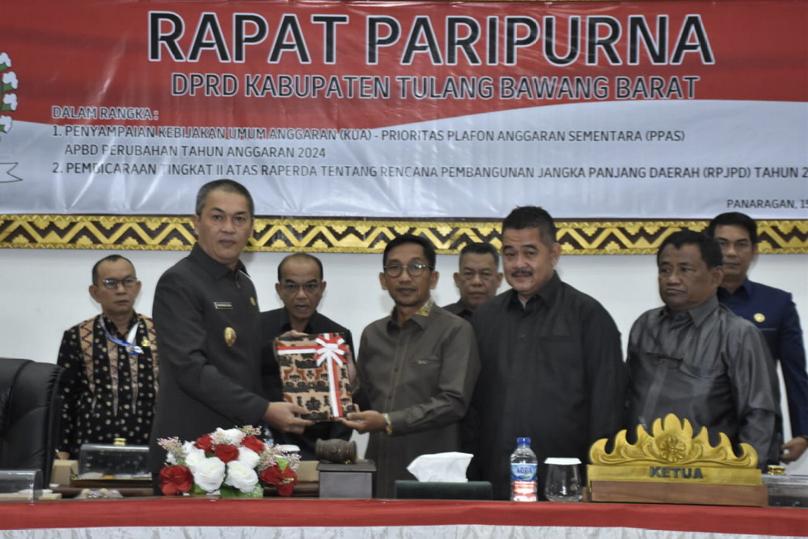 Rapat Paripurna Penyampaian KUA-PPAS APBD-P Tahun Anggaran 2024 oleh Pemerintah Daerah Kabupaten Tubaba dan Pembicaraan Tingkat II atas Raperda RPJPD Tahun 2025-2045. Dilakukan DPRD Tubaba di Ruang Paripurna DPRD setempat, Senin (15/07/2024)
