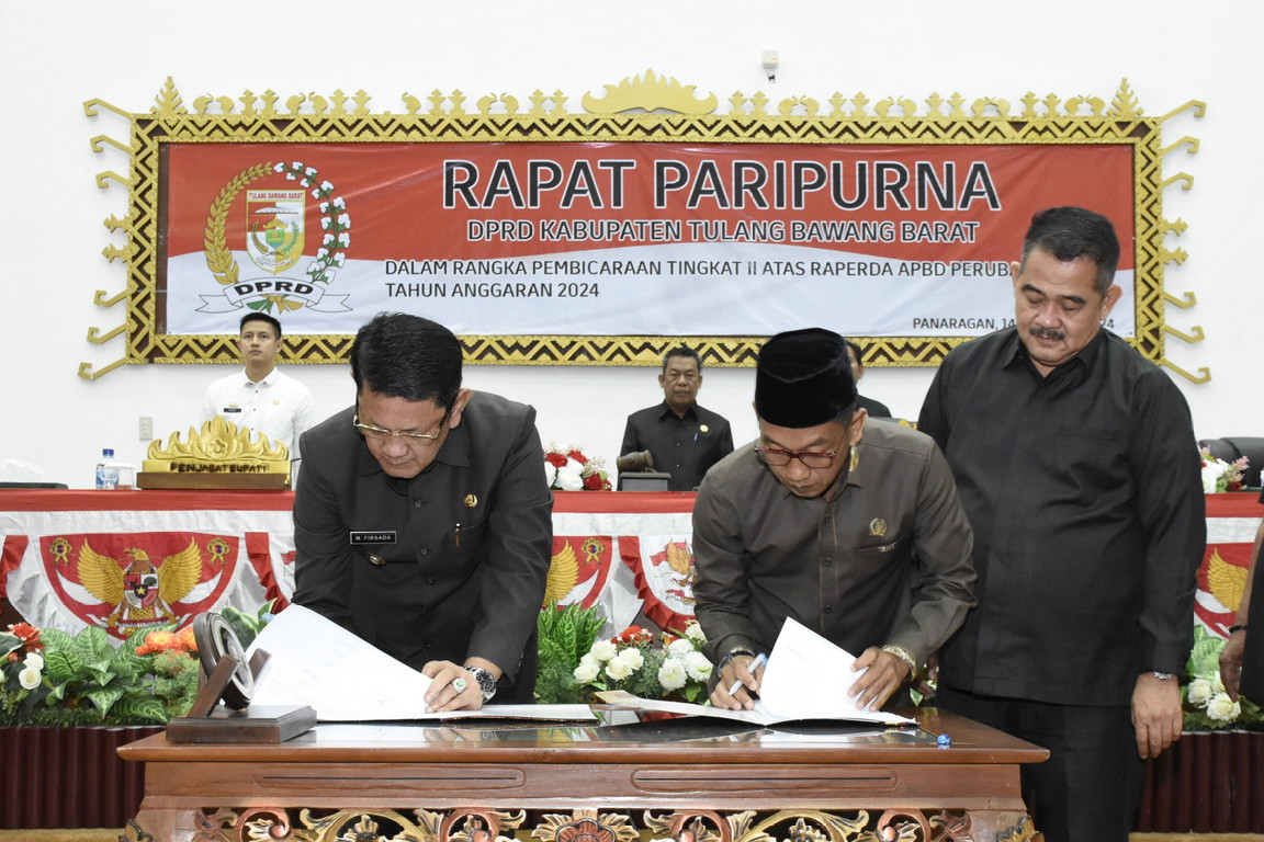 Penjabat (Pj) Bupati Tulang Bawang Barat (Tubaba) Drs. M.Firsada, M.Si sampaikan ucapan terima kasih dan penghargaan kepada seluruh pimpinan dan anggota DPRD Kabupaten Tubaba, yang telah bersama-sama melakukan kesepakatan atas Raperda tentang Perubahan APBD Kabupaten Tubaba Tahun Anggaran 2024 .
