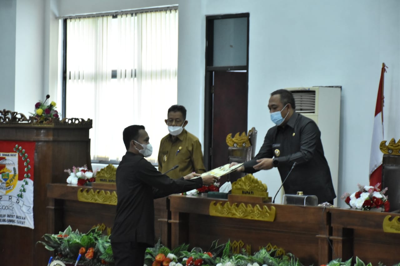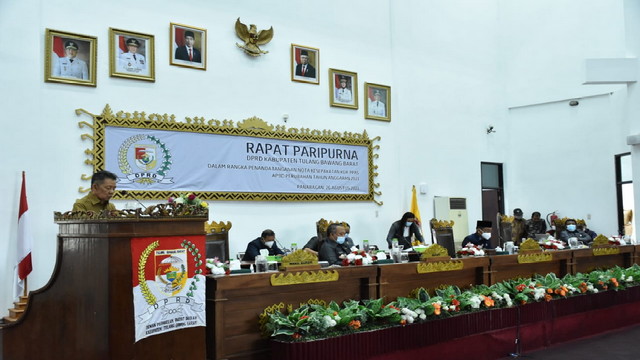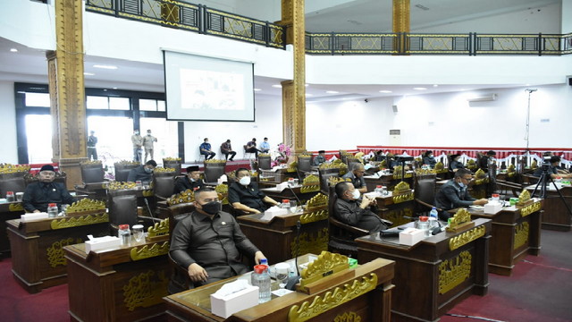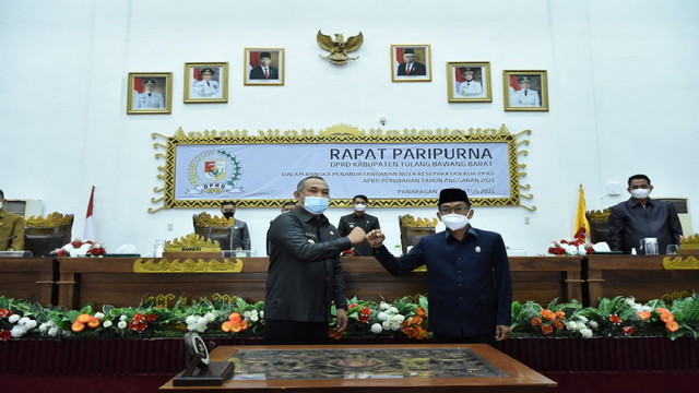 Rapat Paripurna Dewan Perwakilan Rakyat Daerah (DPRD) Kabupaten Tulangbawang Barat dalam Rangka Penandatanganan Nota Kesepakatan KUA-PPAS APBD Perubahan Tahun Anggaran 2021. Di Ruang Paripurna DPRD setempat, Kamis 26/08/2021