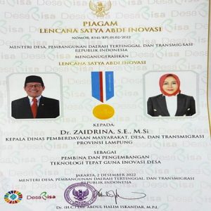 JAKARTA.- Menteri Desa, Pembangunan Daerah Tertinggal, dan Transmigrasi Republik Indonesia, Dr (HC) Drs. Abdul Halim Iskandar, M.Pd menganugerahkan Lencana Satya Bakti Inovasi kepada Dr. Zaidirina, S.E.,M.Si, Kepala Dinas Pemberdayaan Masyarakat Desa dan Transmigrasi Provinsi Lampung yang juga sekaligus Penjabat Bupati Tulangbawang Barat, pada hari Jum’at, 2 Desember 2022 pukul 19.30 bertempat di Kantor Kementerian Desa, Pembangunan Daerah Tertinggal, dan Transmigrasi Republik Indonesia.