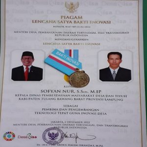 Pada kesempatan itu juga Menteri Desa, Pembangunan Daerah Tertinggal dan Transmigrasi juga menganugerahkan Lencana Satya Bakti Inovasi kepada dirinya sebagai Kepala Dinas Pemberdayaan Masyarakat dan Tiyuh Kabupaten Tulangbawang Barat sebagai Pembina dan Pengembangan Teknologi Tepat Guna Inovasi Desa. “Anugrah ini juga diberikan kepada Heri Irawan dan Yuli Sunaryo, Juara Nasional Teknologi Tepat Guna Unggulan Tahun 2022 dari Tiyuh Mekar Asri, Kecamatan Tulangbawang Tengah, Kabupaten Tulangbawang Barat.”urainya.