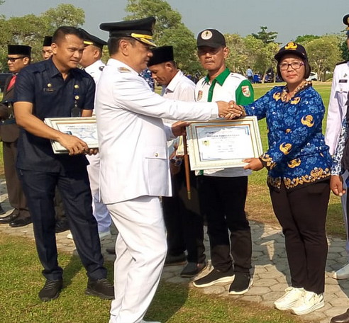 Sepuluh penghargaan diserahkan langsung oleh M.Firsada Pj.Bupati Tulangbawang Barat dan Forkopimda usai upacara peringatan hari kemerdekaan Republik Indonesia tingkat Kabupaten Tulangbawang Barat di lapangan kantor Pemkab Tubaba pada Sabtu (17/08/2024).