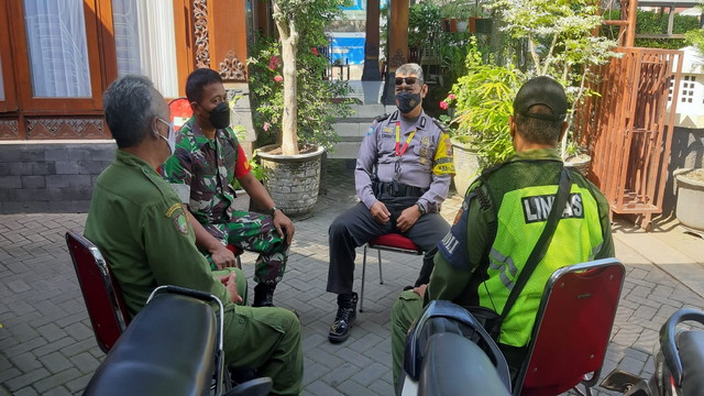 Surakarta. – Babinsa Kelurahan Bumi Koramil 01 Laweyan Kodim 0735 Surakarta Serda Agus bersama Bhabinkamtibmas melaksanakan Komsos dengan anggota Linmas kelurahan Bumi, Bertempat dihalaman kantor kelurahan Bumi kecamatan Laweyan, Sabtu 03/09/2022.