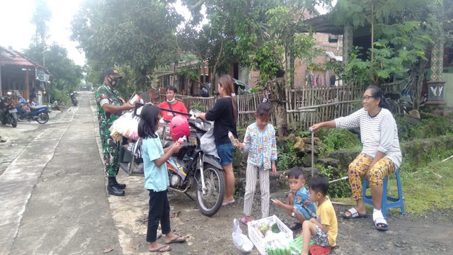 Anggota Koramil 12 Simo Kodim 0724/Boyolali Serda Suyadi, Serka Marwoto dan Serda Supardi bersama Tim Satgas Covid 19 Kecamatan Simo melaksanakan sosialisasi dan edukasi kepada warga agar tetap menerapkan protokol kesehatan 5M (Memakai Masker, Menjaga Jarak, Mencuci Tangan, Menghindari Kerumunan dan Membatasi Mobilitas) di Desa Wates Kecamatan Simo Kabupaten Boyolali.Minggu 14/02/2021.