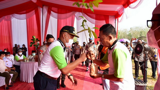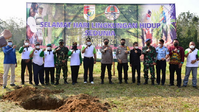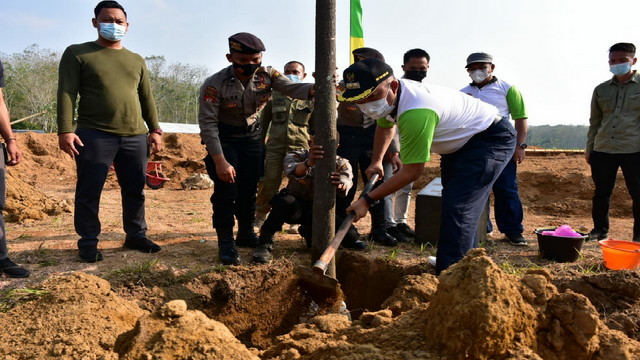 Bupati Tulangbawang Barat Umar Ahmad, SP memperingati Hari Lingkungan Hidup Se-Dunia Tahun 2021 di Lahan Calon Mapolres Tulangbawang Barat sekaligus melaksanakan Peletakan Batu Pertama Pembangunan Mapolres setempat, Panaragan Jum’at 11/06/2021.