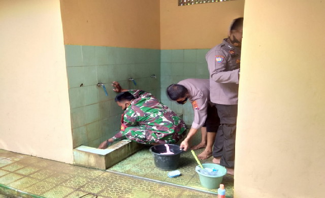 Anggota Koramil yang dipimpin Sertu Sutarto beserta Kapolsek AKP Aman Margono dan anggota Polsek, bersama Takmir Masjid Umar Jam Zaini dan Remaja Masjid Nurul Islam, tampak membersihkan lingkungan sekitar Masjid.