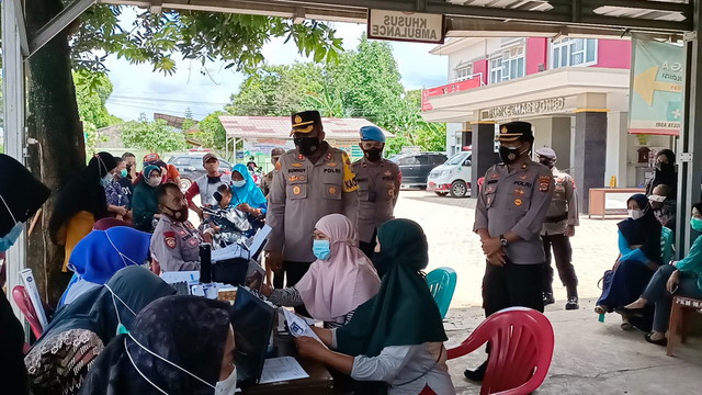 Kapolres Tulangbawang Barat AKBP Sunhot P Silalahi, S.IK., M.M. meninjau kegiatan vaksinasi di Hut PMI ke 76 dan gerai vaksinasi PKM Mulya Asri, Kecamatan Tulang Bawang Tengah, Kabupaten Tubaba.