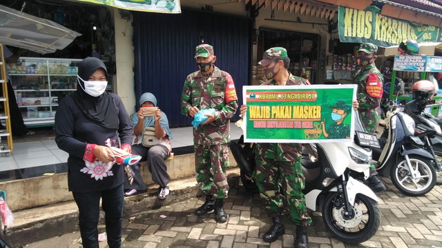 Wonogiri. – Demi memutus penyebaran Covid-19 dan pendisiplinan protokol kesehatan kepada masyarakat, Serda Sidiq beserta rekan anggota Babinsa Koramil 03/Ngadirojo, melaksanakan pendisiplinan pemakaian masker disekitar pasar Ngadirojo, Sabtu 21/08/2021.