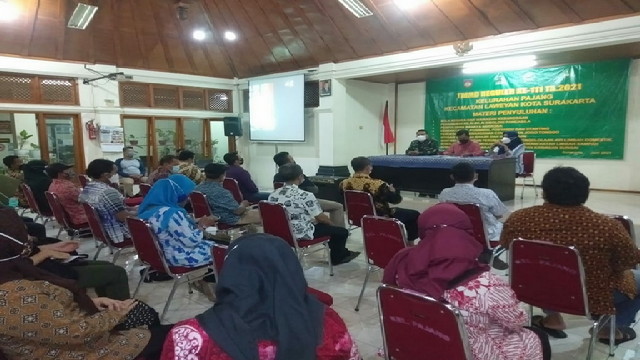 Pada Jum’at 25/06/2021 malam, Kodim 0735/Surakarta berkesempatan memberikan materi untuk pertama kalinya dalam kegiatan non fisik. Bertempat di Aula Kelurahan Pajang, Jl. Sidomukti Utara I, No: 7 Kelurahan Pajang, Kecamatan Laweyan Kapten Cba Tri Rusman Prasetyo yang menjabat sebagai Perwira Seksi Teritorial (Pasiter) Kodim memberikan penyuluhan tentang Bela Negara dan Wawasan Kebangsaan, dalam rangka TMMD Reguler ke 111 TA.2021 Kelurahan Pajang yang dihadiri oleh 45 orang peserta.