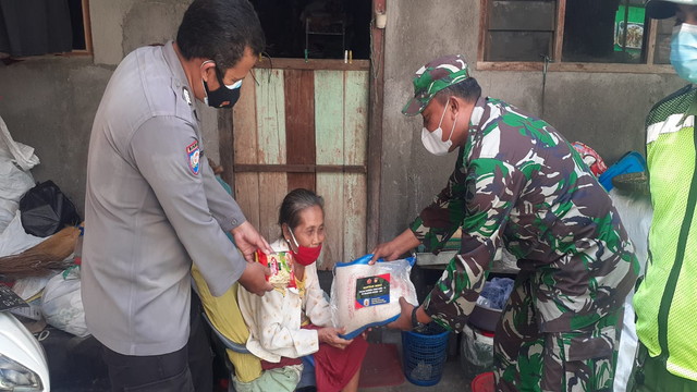 Surakarta, Babinsa Kelurahan Gandekan Koramil 04/Jebres Kodim 0735/Surakarta Serda Teguh K bersama Bhabinkamtibmas setempat melaksanakan kegiatan penyaluran bantuan berupa beras dan mie instan dari TNI AD kepada warga masyarakat yang kurang mampu bertempat di Kelurahan Gandekan Kecamatan Jebres Kota Surakarta, Jum’at 30/07/2021.