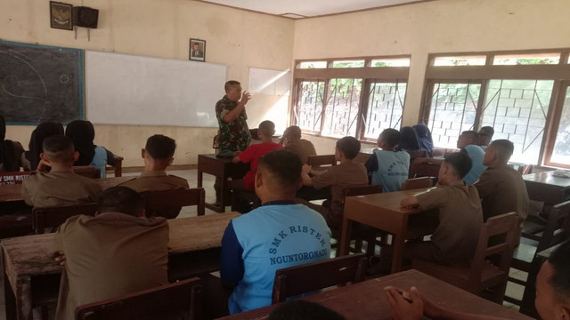 Wonogiri. – Anggota Koramil 04/Nguntoronadi Serma Memed Mulyadi dan Serka Rozak, berkesempatan nemberikan pelatihan dasar kepemimoinan dan penyuluhan bela negara, kepada siswa-siswi SMK Ristek kelas X dan XI sebanyak 115 orang, Sabtu 16/07/2022.