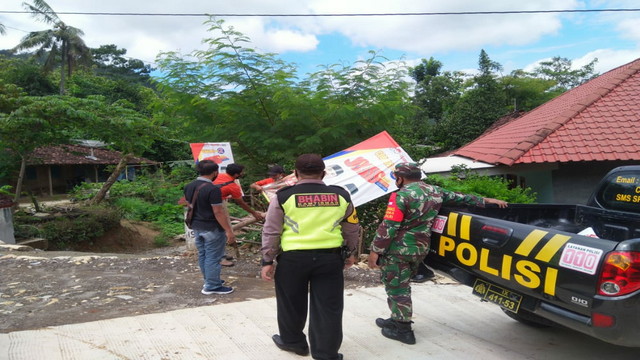 Wonogiri.- Anggota Koramil 23/Karangtengah Serda Eko Agus dan Koptu Suyanto melaksanakan kegiatan pendampingan penertiban dan penurunan alat peraga kampanye (APK) oleh Panwascam Karangtengah diwilayah Kecamatan Karangtengah, Kabupaten Wonogiri, Senin 07/12/2020.