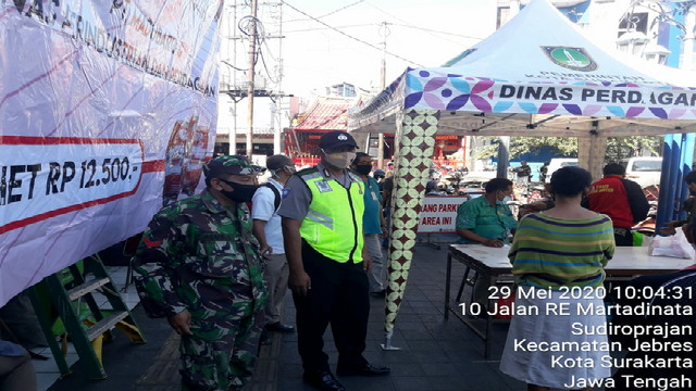Tampabatas.com(SMSI), Surakarta.- Sejak pukul 08.00 wib sampai selesai Babinsa Kelurahan Sudiroprajan Koptu Agus S Koramil 04/Jebres Kodim 0735/Ska.Monitoring kegiatan Operasi Pasar murah yg bertempat di halaman Pasar Gede Surakarta yang dilaksanakan oleh Diskoperindag dan PT. Madubaru Gula Kristal Putih (MK) Madukismo dari Jogyakarta yakni pengadaan gula pasir murah. Jum’at 29/05/2020.