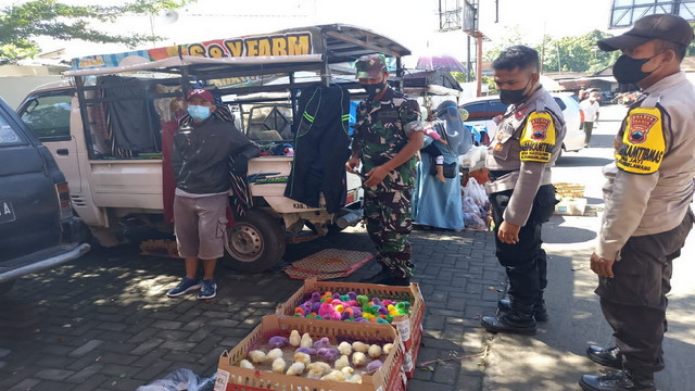 Surakarta.- Babinsa Koramil 04/Jebres Kodim 0735/Surakarta Serma Samsuri bersama Polsek Jebres melaksanakan Operasi Yustisi untuk menerapkan protokol kesehatan serta pembagian masker di Pasar Ledoksari Kelurahan Purwodiningratan Kecamatan Jebres Surakarta, Minggu 07/03/2021.