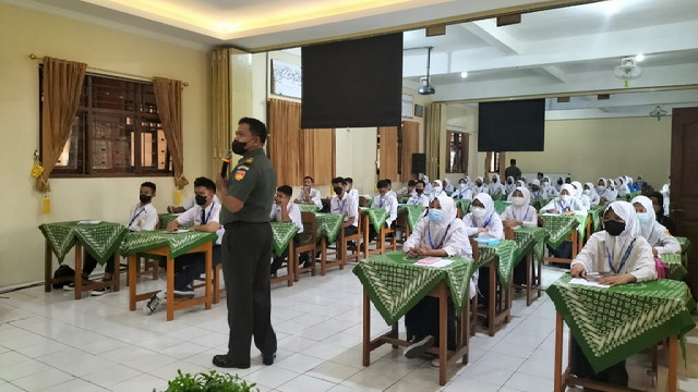 Surakarta. – Perwira Seksi Teritorial (Pasiter) Kodim 0735/Surakarta Kapten Coba Kurdi didampingi Babinsa Kelurahan Pajang Serma Puri dan Serda Tonny H memberikan materi wawasan kebangsaan dan bela negara kepada 49 siswa pelajar SMK muhamadiyah 4 Surakarta di aula SMK muhamadiyah 4 Surakarta Kelurahan Pajang kecamatan Laweyan, Rabu 13/07/2022.