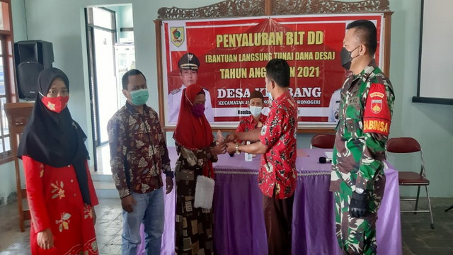 Wonogiri.– Serma Widhi Anugrah Babinsa Desa Kembang Koramil 16/Jatipurno melaksanakan pendampingan dalam kegiatan penyaluran Bantuan Langsung Tunai Dana Desa (BLT-DD) bulan Mei Tahun 2021 yang bertempat di Balai Desa Kembang, Kecamatan Jatipurno, Jum’at 07/05/2021.