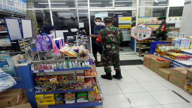Boyolali. Dalam upaya mencegah penyebaran Covid-19 Koramil 19/Juwangi Kodim 0724/Boyolali melalui 2 orang Babinsanya Serda Sri Wahyono dan Serda Arif Sukoco serta Satpol-PP Kecamatan Juwangi melaksanakan kegiatan patroli yustisi di sekitar swalayan di Dukuh Ledok Rt 05 Rw 02 Desa Pilangrejo Kecamatan Juwangi Kabupaten Boyolali, Selasa malam 11/01/2022