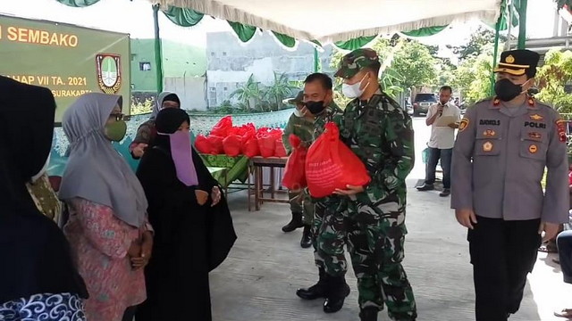 “Adapun pelaksanaan pembagian Paket sembako di berikan secara simbolis oleh Kasdim 0735/Surakarta Mayor Inf Alfian Yudha praniawan kepada 20 Orang Warga Masyarakat.