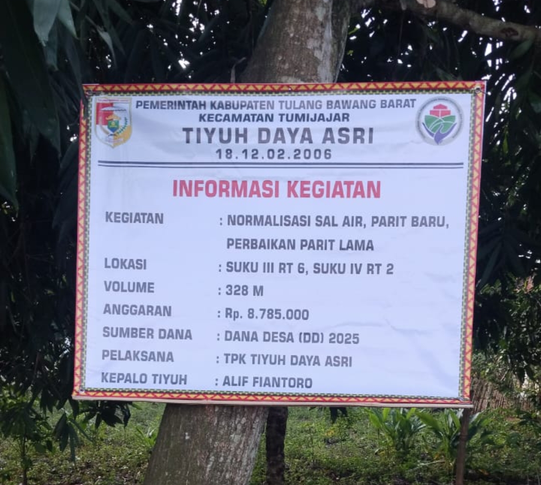 Dalam rangka meningkatkan kesejahteraan masyarakat , Pemerintah Tiyuh Daya Asri, Kecamatan Tumijajar, Kabupaten Tulangbawang Barat, Lampung merealisasikan Dana Desa (DD) Tahun 2025 dengan terus melakukan pembangunan, salah satunya melakukan normalisasi saluran air, parit baru atau pun perbaikan parit lama.